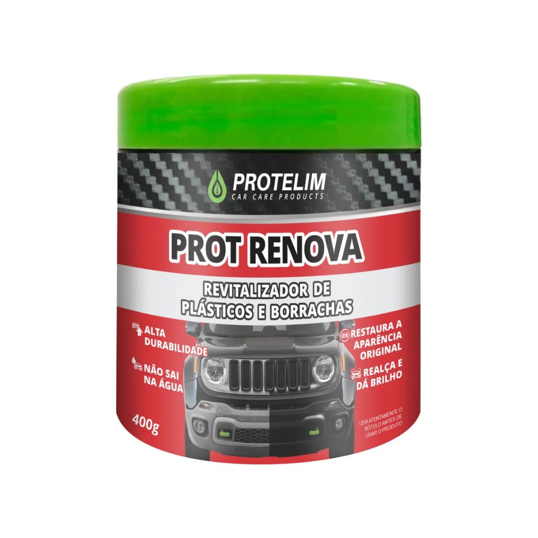 PROT RENOVA é um revitalizador de plásticos e borrachas, sem silicones, desenvolvido para renovação de para-choques, frisos e borrachas. É capaz de remover manchas de ceras e massas de polir.